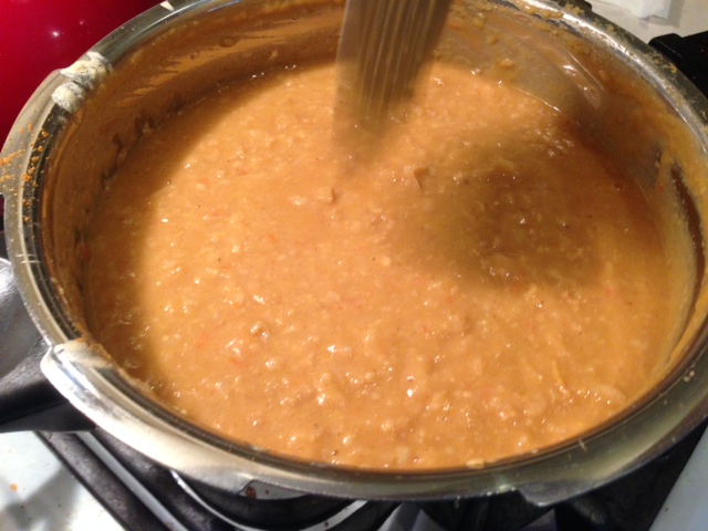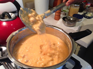 1. Rinse and drain garbanzo beans. Put in pressure cooker with potatoes and cover with water plus an inch, cook for four whistles (you may need to cook longer if your beans are old). When cooked, mash the potato roughly up into bits. NOTE: The potato is there for a thicker consistency to the sauce -- if time is short can use canned cooked garbanzo beans and either cook the potato separately or leave out entirely.